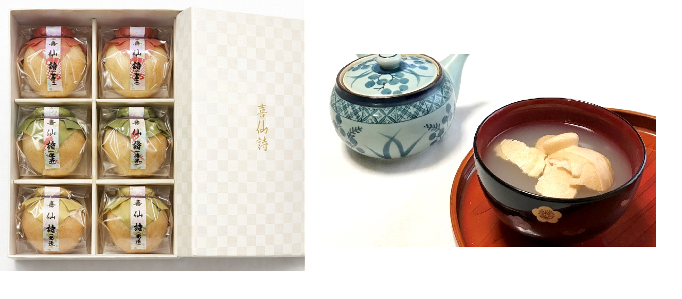 - 喜仙詩(きせんし)」は、最中種の中に香り豊かな汁粉の粉末を閉じ込めた、昔ながらの“懐中しるこ”です。